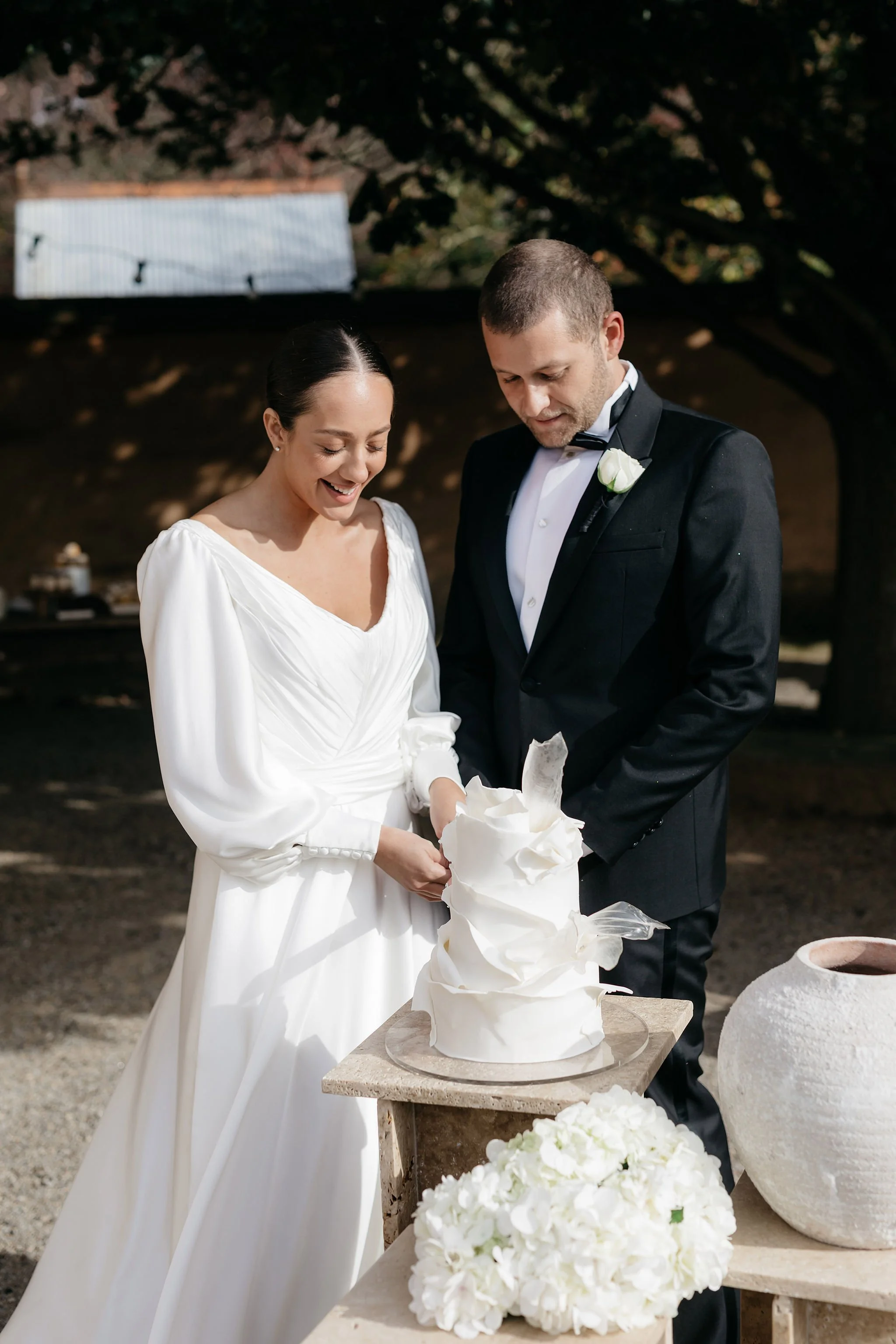 Having a leisurely lunch was what greeted Jucinta and Jack’s guests when we set up a long table with the view behind them. Florals by Jack’s mum and vases handcrafted by Jucinta’s mum adorned the long table lined with bottles of their favourite red wines and crystal glassware.