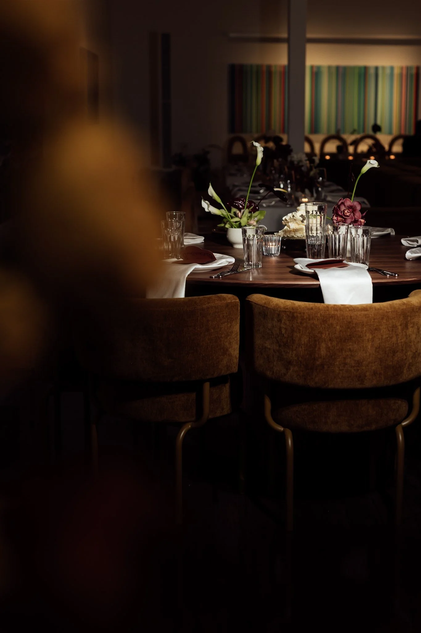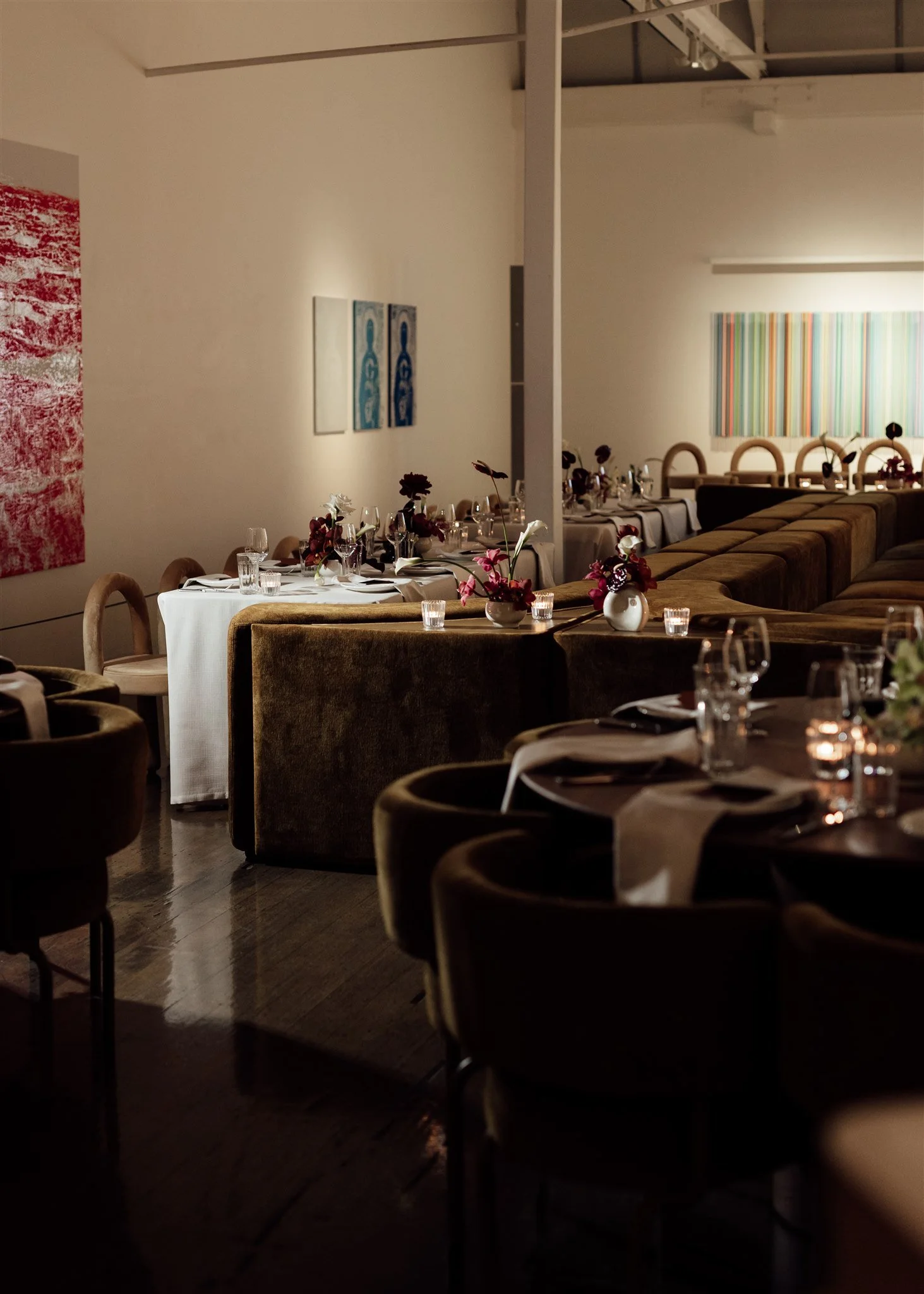 We layered neutral tones with sculptural floral moments, tactile surfaces, and custom brand details. Velvet banquette seating in rich olive and earthy browns created an inviting softness against the gallery's clean lines, paired with warm wooden tables from Dann Event Hire. Neutral weave linens from Table Art added understated texture, while deep-toned, minimal floral arrangements by Flowers Vasette brought a grounded elegance to the space.